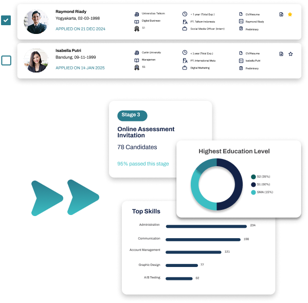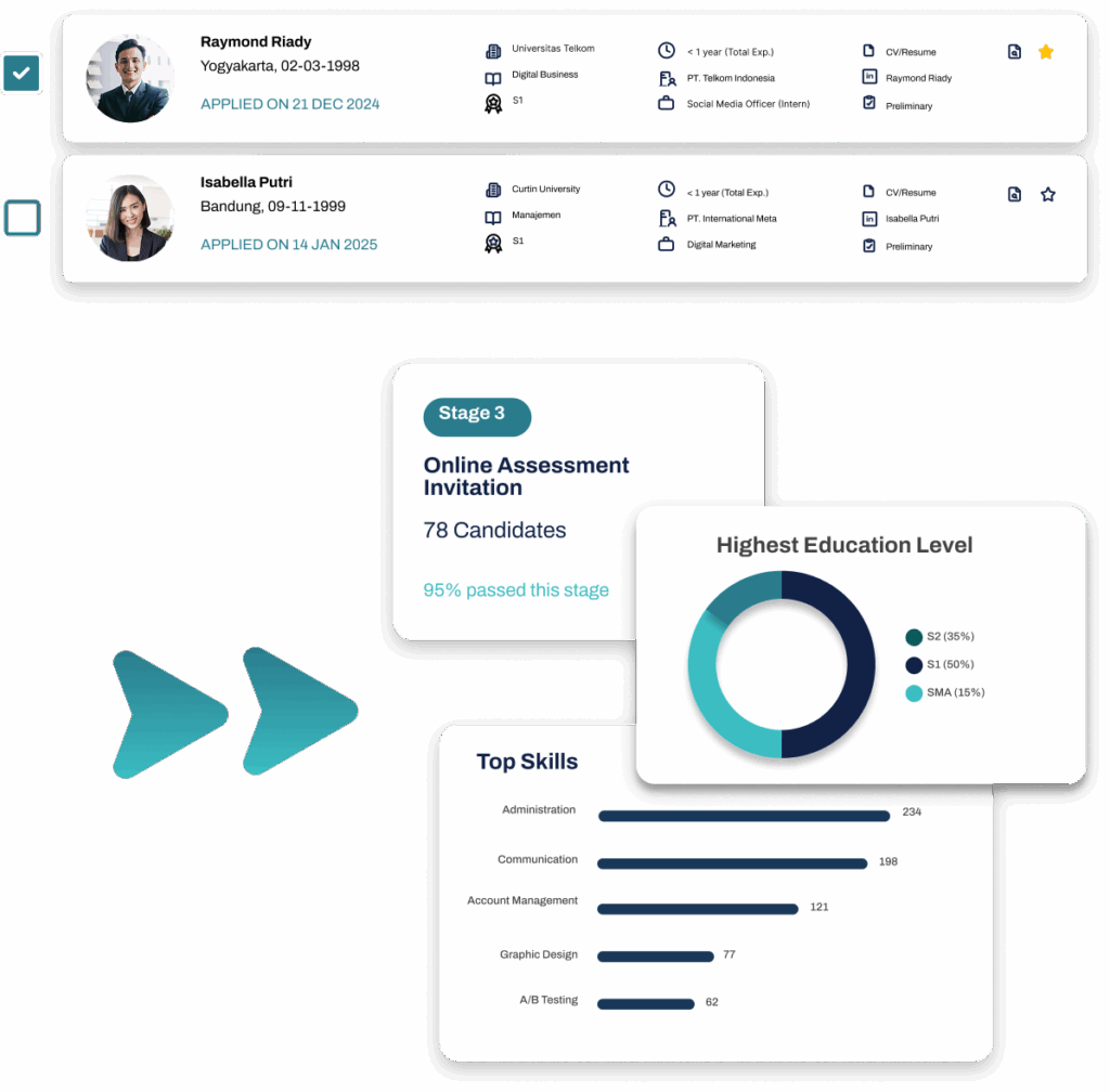 Shape recruitment flows that match your process, and monitor candidate progress with complete visibility at every step.