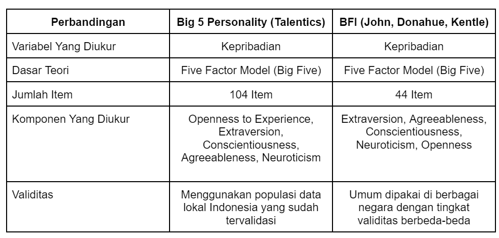 Tidak, Big 5 Personality bukanlah Big Five Inventory (BFI). Big 5 Personality dan BFI adalah dua alat tes yang berbeda, walaupun keduanya sama-sama mengukur kepribadian yang didasarkan pada teori Five Factor Models atau sering disebut dengan Big Five. Secara singkat perbandingan untuk keduanya dapat dilihat pada tabel berikut:
