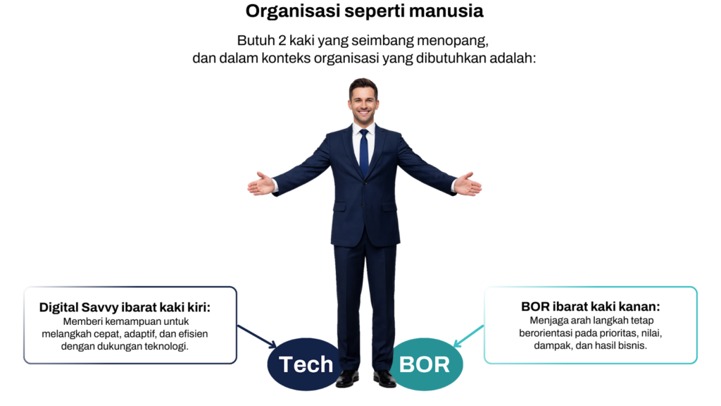 Jika dianalogikan organisasi sebagai tubuh manusia, maka Digital Savvy adalah kaki kiri dan BOR adalah kaki kanan organisasi. Tentu, organisasi masih bisa bergerak ketika hanya salah satunya saja yang lebih kuat, tetapi langkahnya akan pincang. Tetapi percepatan yang sesungguhnya hanya akan terjadi ketika keduanya tumbuh seimbang dan saling menguatkan dalam setiap keputusan dan perilaku kepemimpinan.