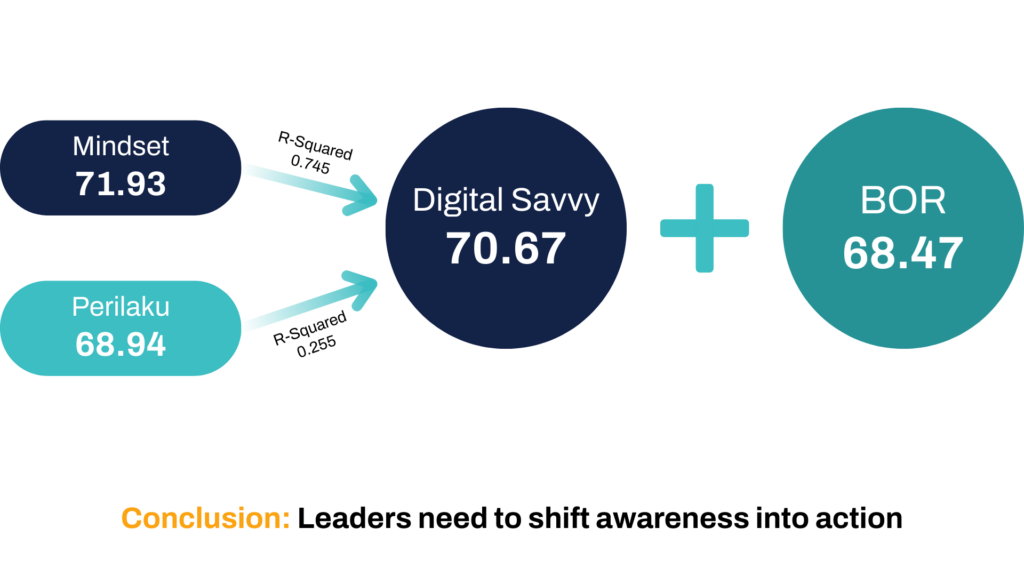 Pada Gambar 2 terlihat bahwa Digital Savvy (70,67) dibentuk oleh dua komponen utama yang belum sepenuhnya seimbang, yakni mindset (71,93) dan perilaku (68,94). Secara kolektif, temuan ini menunjukkan bahwa para leader sebenarnya sudah memiliki cara pandang yang relatif matang terhadap teknologi. Mereka memahami pentingnya digital dalam konteks bisnis, terbuka terhadap perubahan, serta menyadari potensi teknologi sebagai enabler kinerja dan nilai organisasi.