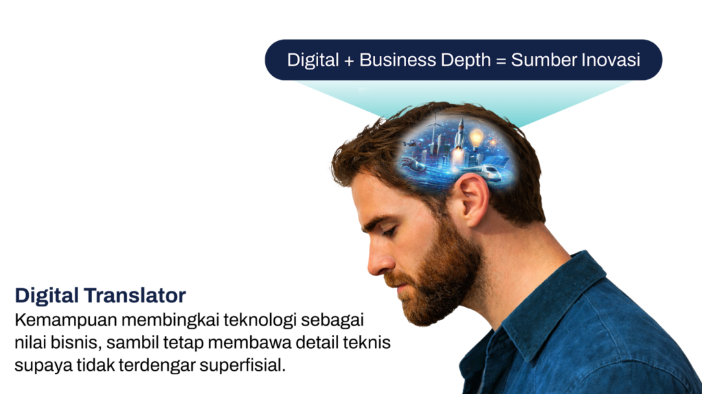 Dalam peran ini, pemimpin tidak bertindak sebagai eksekutor teknis, melainkan sebagai digital translator: penghubung yang memastikan kompleksitas teknologi dapat diterjemahkan menjadi keputusan bisnis yang relevan dan bernilai.