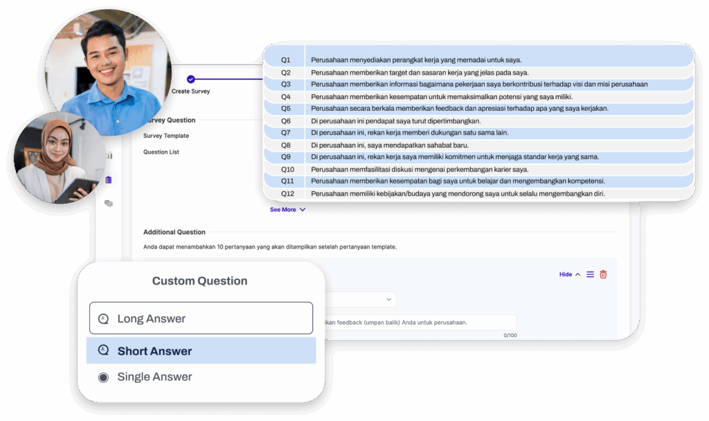 Build surveys tailored to your organization’s unique needs. Add specific, relevant questions to understand your team’s dynamics better.