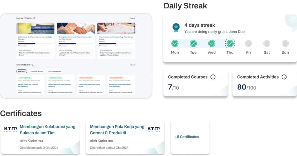 Track development in real time with intuitive dashboards that consolidate progress across teams. Interactive reports give leaders clear visibility, while digital certificates provide employees and the organization with tangible proof of achievement.
